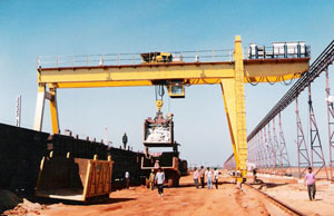 M&F MHE manufactures Gantry Cranes ranging from 1Ton to 60 Ton Capacity and up to 45 meters span and Height of lift as per customer’s requirement. These are generally used outdoors in Engineering Industries, Ship yards, Ports, Granite, Steel Yards, Cement Pipe Industries, Open Yard, Storages places, Container Depots etc. M&F MHE makes Single Girder and Double Girder type and these cranes are run on floor mounted rail by its two legs fabricated from steel sections.Our cranes are manufactured with better design and of high standard of quality coupled with strict safety regulations. Supplied Gantry cranes, solving problems in lifting & handling area, using effective design, increased quality & safety for greater reliability. M&F MHE manufactures Gantry / Goliath cranes up to 50 MT Cap., 60 M Span +10 M overhang on either side.